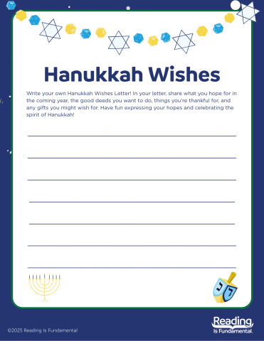 Use this Hanukkah Wishes template to help you practice writing a friendly letter! In your letter, share what you hope for in the coming year, the good deeds you want to try, things you’re thankful for, and any gifts you’re wishing for. Have fun expressing your hopes and holiday spirit!